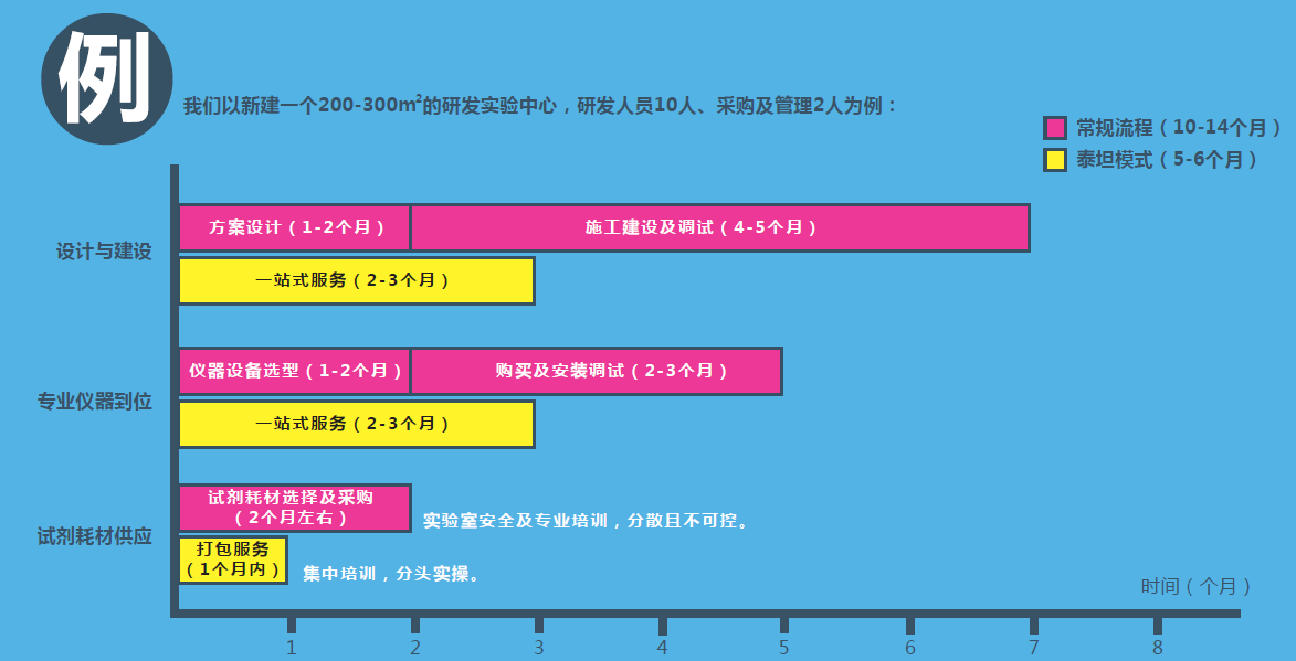 我们以新建一个200-300m2的研发实验中心为例,从方案设计、施工建设及调试到最终试剂耗材到位大约需要10-14个月的时间,如果有幸你找到了一家像掷元科技(Titan)这样的科研服务一站式的提供商,这个时间会大大缩减。据保守估计,通过掷元(Titan)的科研一站式服务,可至少减少50%的时间成本,节约直接成本超过15%,节约间接成本80—100万元。