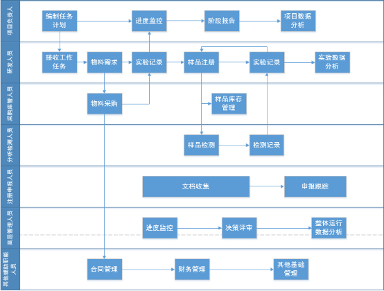 同时对于项目执行过程中的样品管理、采购管理、物料管理、注册管理、合同管理、专利管理、临床管理等各个环节提供定制化的流程管理。