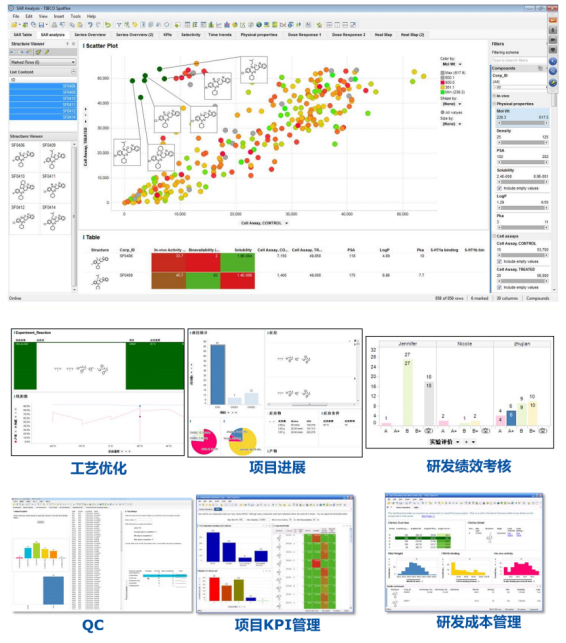 支持通过科学数据的汇总、分析和展示进行有效的决策。支持分子结构数据文件的导入,分子性质计算,RGroup分析、组合化学分析以及各种与研发相关的商业分析。